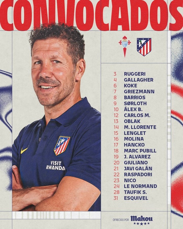 10月5日讯 西甲第8轮比赛,马竞将在客场对阵塞尔塔,马竞公布了此役的球员名单。穆索身体不适缺席,吉梅内斯、阿尔马达、卡尔多索继续伤缺。